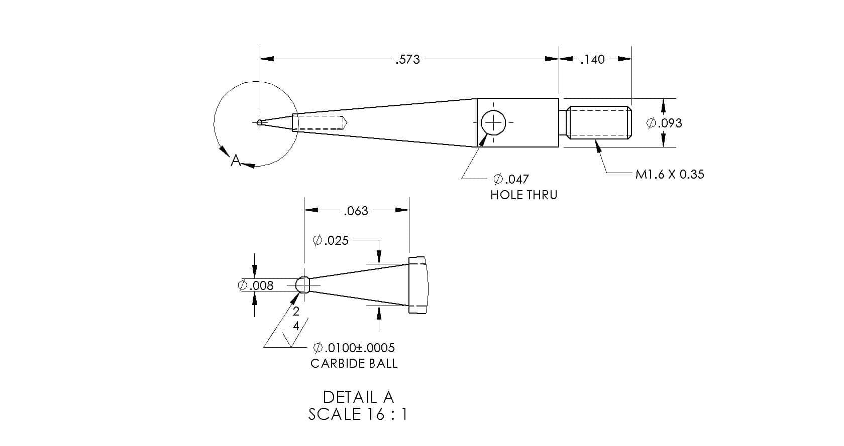 M1.6 Thds, Ø.010″ Carbide Ball X .573″ Long.