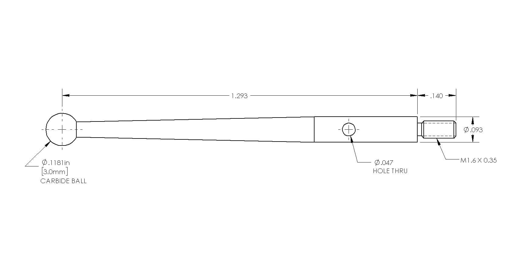 M1.6 Thds, Ø3.0mm Carbide Ball X 1.293″ Long.