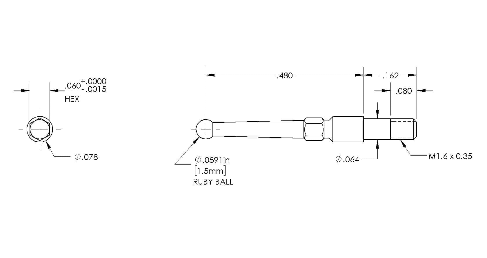 M1.6 Thds, Ø1.5mm Ruby Ball X .480″ Long.