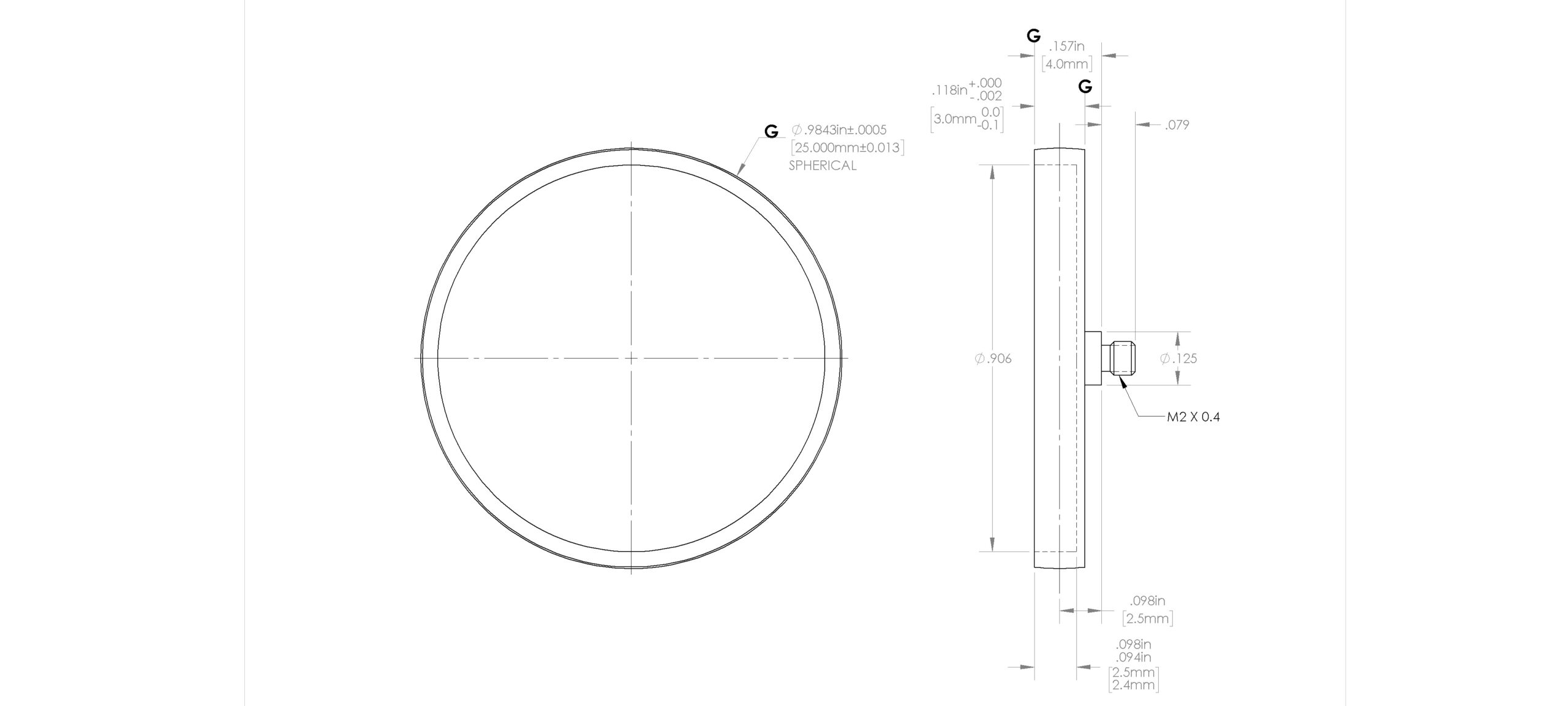 Hardened 440C Stainless Steel Disk, M2 Thds, Ø25.0mm Spherical Dia. X 3.0mm Disk Depth, Ø3.18mm Dia. Stem X 2.5mm E.W.L., 2.5mm Range Length