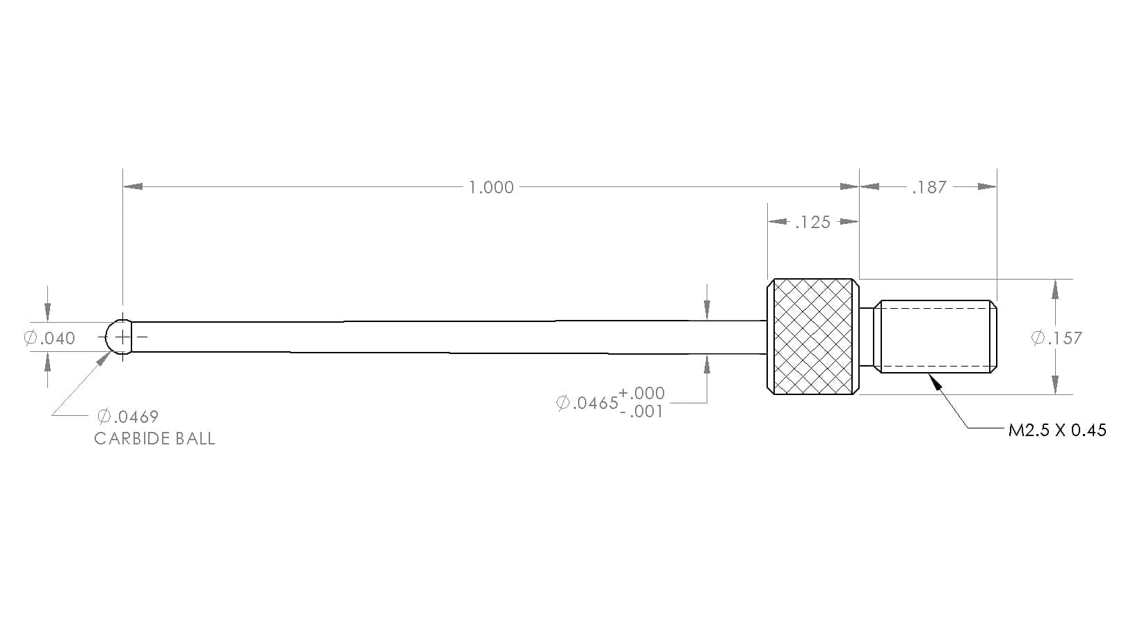 M2.5 Thds, Narrow Tapered Ball Contact (Tapered Stem is Smaller than Ball), Ø.046875″ Carbide Ball, Ø4.0mm Body Dia X 1.00″ Long