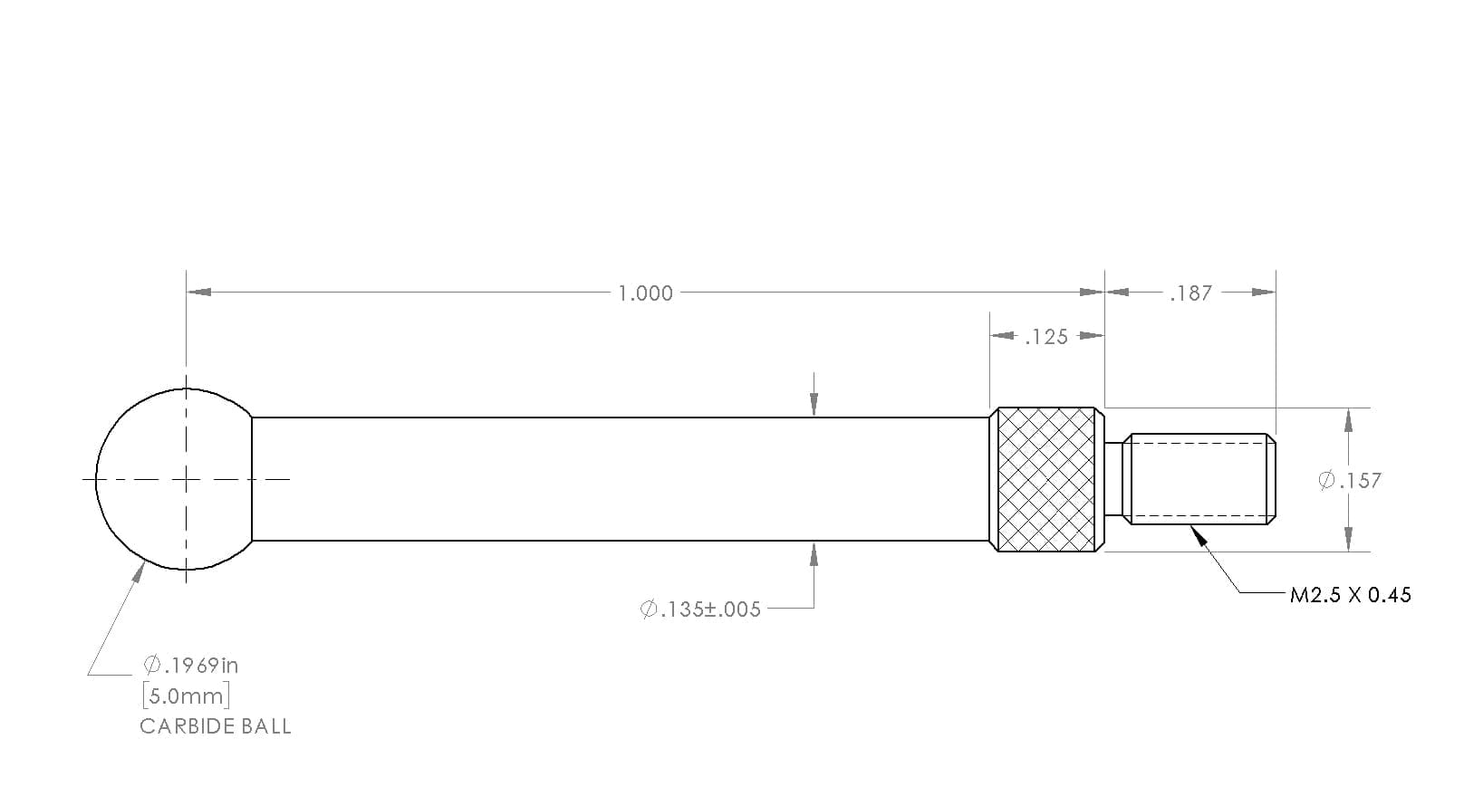 M2.5 Thds, Straight Stem Ball Contact, Ø5.0mm Carbide Ball on Ø.135″ Dia Stem, Ø4.0mm Body Dia X 1.00″ Long