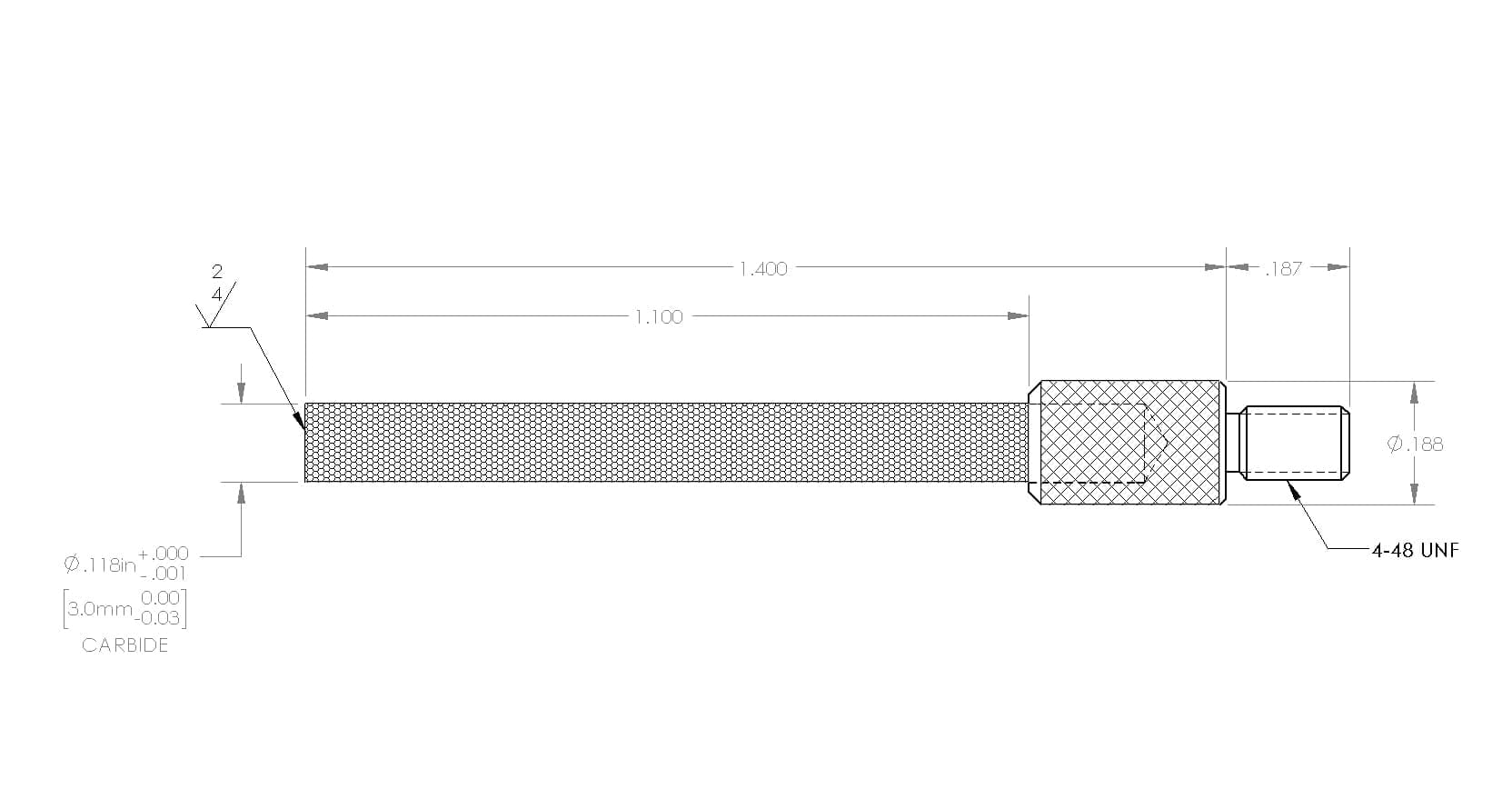 4-48 Thds, Carbide Tipped, Flat End Needle Contact, 1.400″ Long, Ø3.0mm Dia Stem X 1.100″ E.W.L.